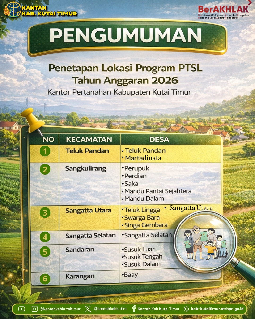 Kepala ATR/BPN Kutim, Akhmad Saparuddin, menyebut dua program tersebut yakni Pendaftaran Tanah Sistematis Lengkap (PTSL) dan Program Redistribusi Tanah.